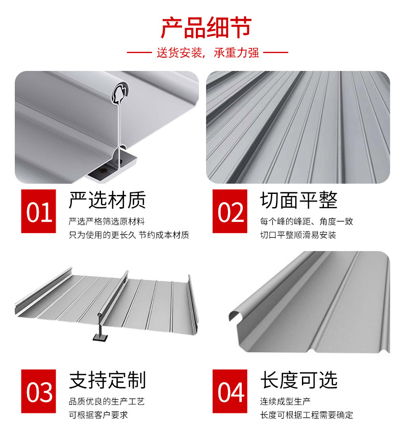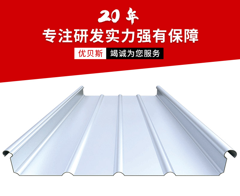 這種屋面板的270°咬合工藝皆有自動咬合機扣咬雙邊單支座全自動專業操作縫合而成,而扣合邊與支座形成的包裹扣合方式又巧妙的解決了因熱脹冷縮產生的物理位移。該優勢反映在:縱向超長的大跨度屋面系統不因內外部受力影響變形。同時本屋面系統完整齊全的附件供應可滿足各種建筑形式的要求。