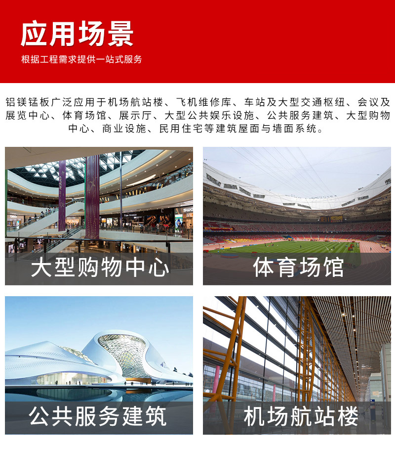 一、關于鋁鎂錳板的簡介:具有耐腐蝕、美觀、重量輕、強度大、容易加工成型等諸多優點,廣泛應用于機場航站樓、飛機維修庫、車站及大型交通樞紐、會議及展覽中心、體育場館、展示廳、大型公共娛樂設施、公共服務建筑、大型購物中心、商業設施、民用住宅等建筑。